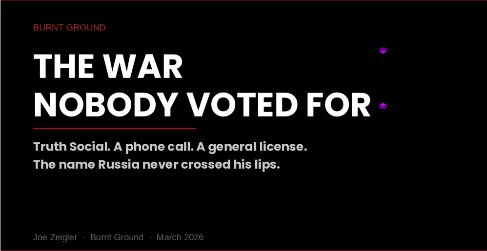 The war started on a Saturday morning, the way the worst ones usually do. Trump announced it on Truth Social — a platform he owns a controlling stake in, worth about $1.2 billion — not in a televised address to the nation, not before Congress, but as a digital dispatch on his personal money machine. An 8-minute video. Posted like a product announcement.